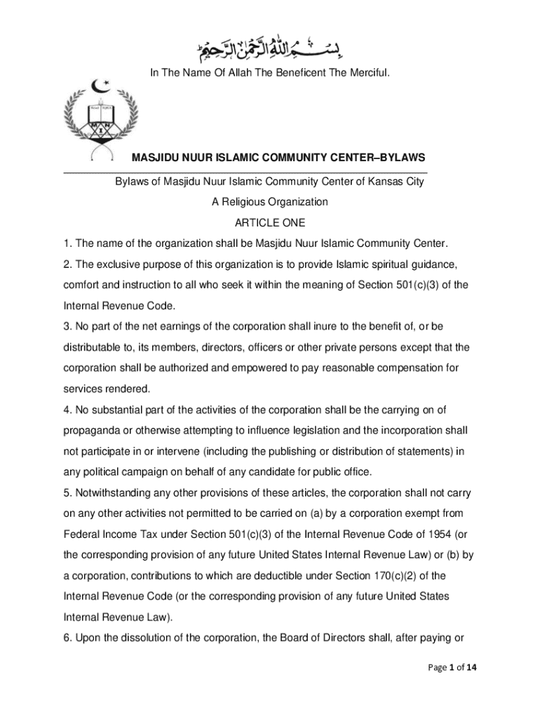 Get the free Bylaws of Masjidu Nuur Islamic Community Center