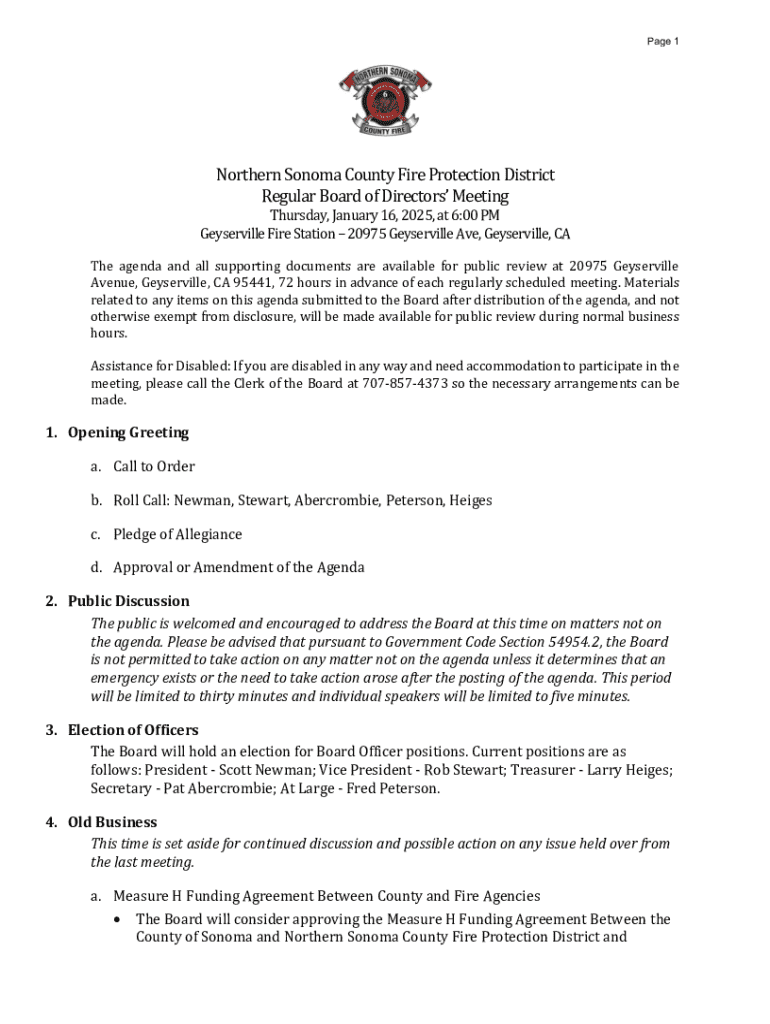This document serves as the agenda for the Northern Sonoma County Fire Protection District\'s regular board meeting, outlining topics of discussion, action items, and approvals required from the board