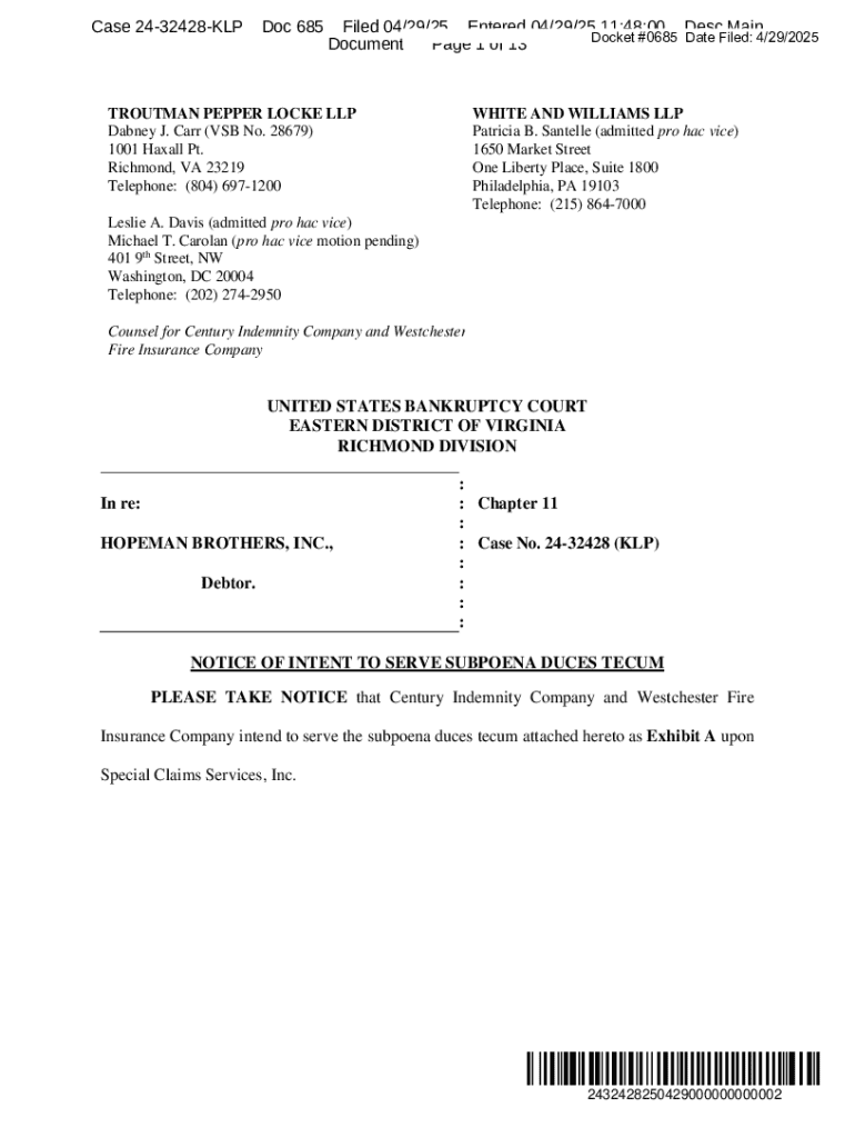 Get the free Notice of Intent to Serve Subpoena Duces Tecum