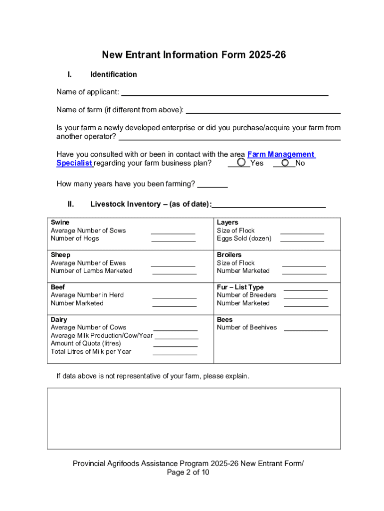 Get the free New Entrant Information Form for the Provincial Agrifoods Assistance Program 2025-26