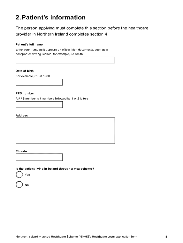 Eligibility for the Norformrn Ireland Planned Healthcare Form is primarily limited to residents of Northern Ireland. Individuals are required to demonstrate proof of residency and may need to provide additional information regarding specific medical conditions that qualify for this form. Generally, patients applying for therapeutic treatments, surgeries, or other specialized medical services will find themselves better suited to apply under this framework.