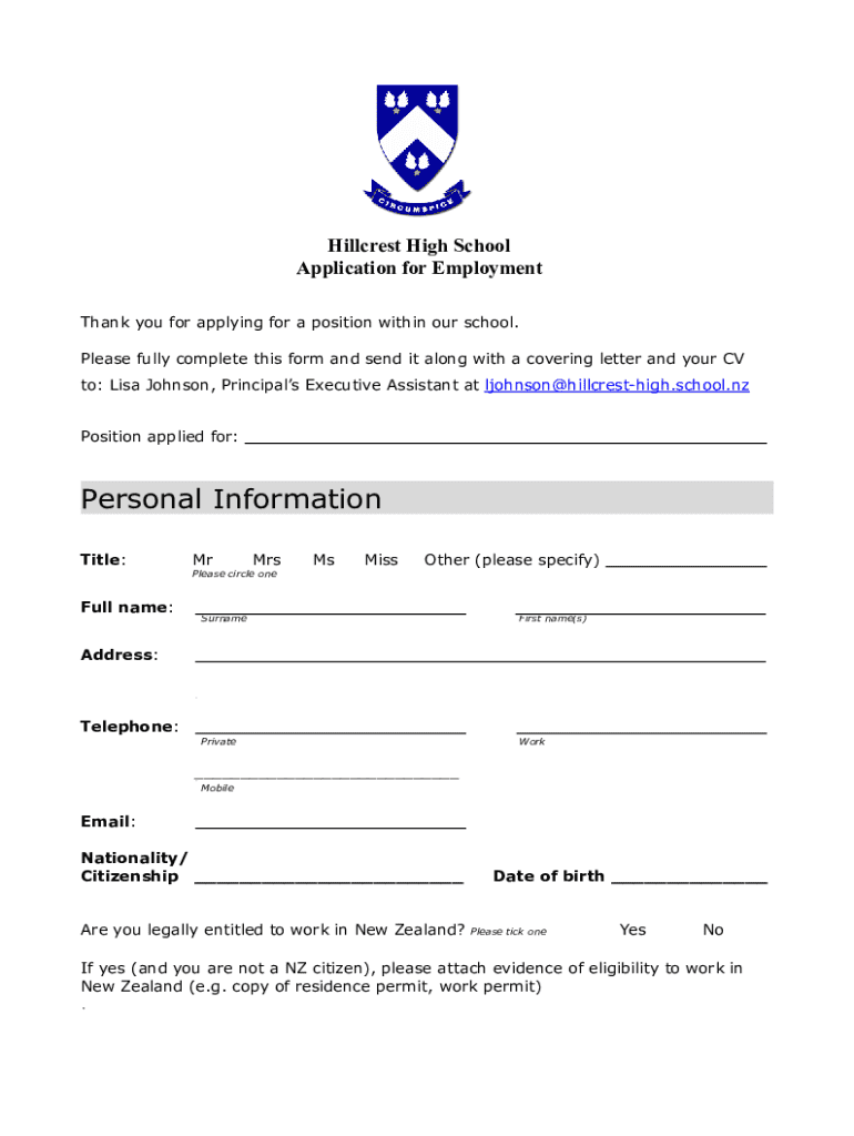 This document is an application form for candidates seeking employment at Hillcrest High School. It solicits personal information, qualifications, work history, and consent for reference checks.