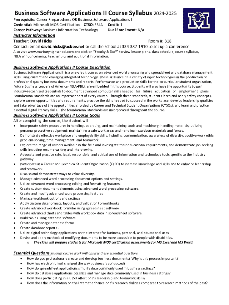 Get the free Business Software Applications Ii Course Syllabus 2024-2025