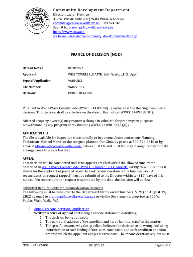 A Notice of Decision (NOD) is an official document issued by a governing body or organization to communicate a decision made regarding a specific request or application. This could range from appeals for healthcare benefits to municipal zoning approvals. Understanding the NOD is crucial for applicants as it influences the next steps they can take to address decisions they may disagree with.