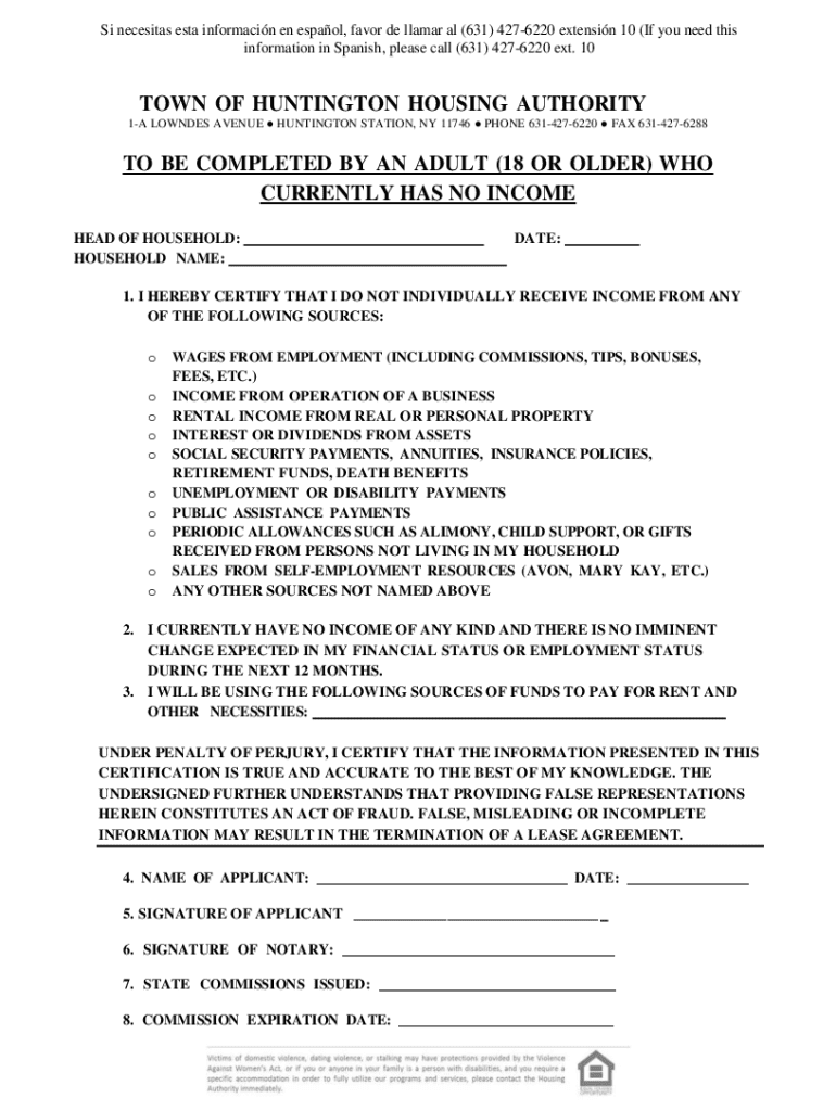 A form for individuals to certify that they currently have no income from various specified sources, necessary for housing or public assistance applications.