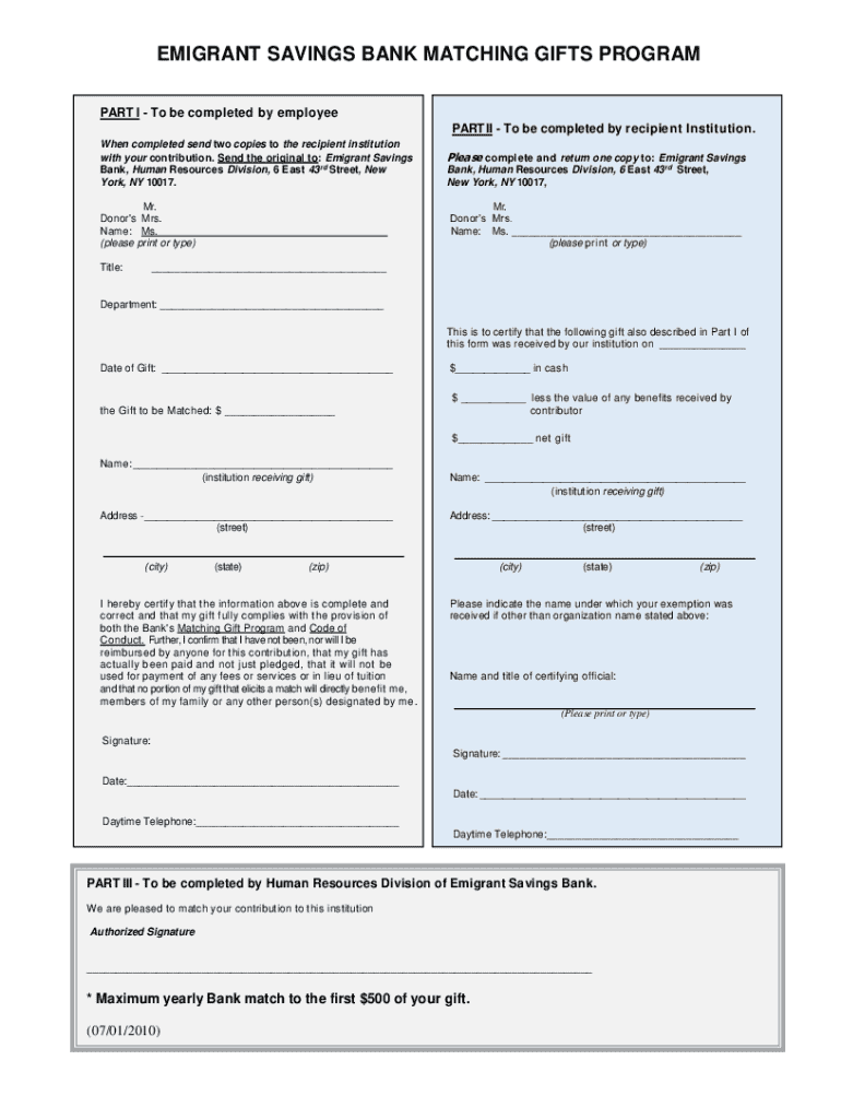 Get the free Emigrant Savings Bank Matching Gifts Program