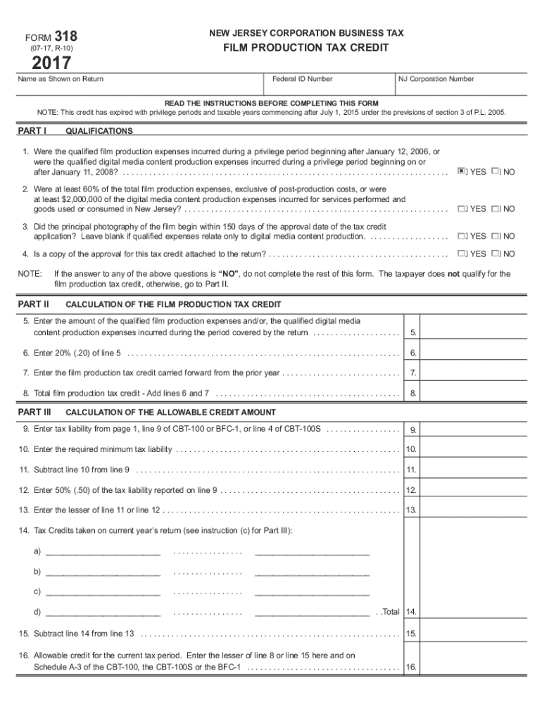 Get the free New Jersey Corporation Business Tax Film Production Tax Credit