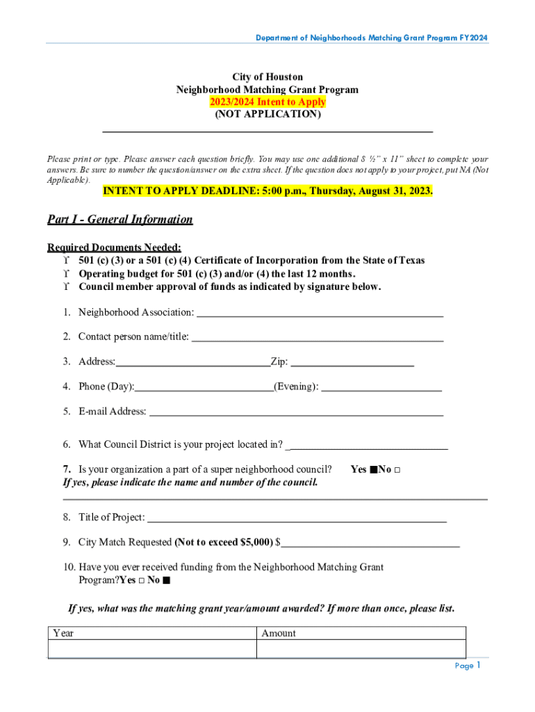 Get the free Neighborhood Matching Grant Program Fy2024 Intent to Apply