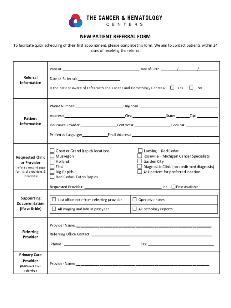 A new patient referral form is a vital document in the healthcare landscape, serving as a bridge between primary care providers and specialists. This form is designed to seamlessly guide patients towards receiving timely and appropriate care, ultimately enhancing patient outcomes. When healthcare providers refer patients to specialists, they facilitate access to advanced treatment options and specialized knowledge, which can be crucial for effective patient management.