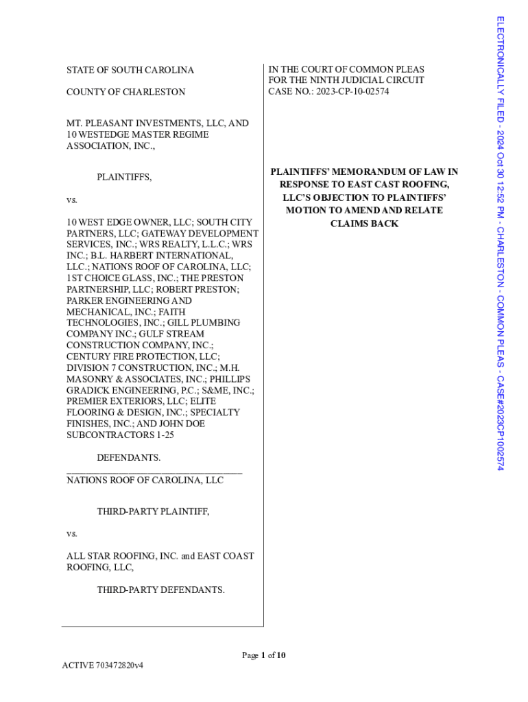 Get the free Plaintiffs' Memorandum of Law in Response to East Coast Roofing, Llc's Objection to ...
