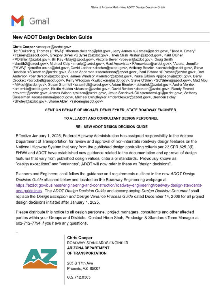 This document provides new guidelines for the Arizona Department of Transportation (ADOT) regarding design decisions for non-interstate roadway features on the National Highway System, effective January