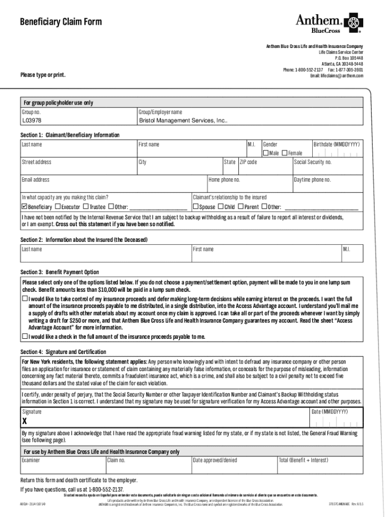 This document is used by beneficiaries to request benefits from Anthem Blue Cross Life and Health Insurance Company following the death of an insured individual. It collects necessary information