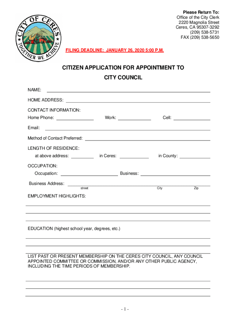 This document invites applications from residents of Ceres, District 1 to fill a vacancy in the City Council due to a member\'s transition to another position. It includes eligibility requirements,