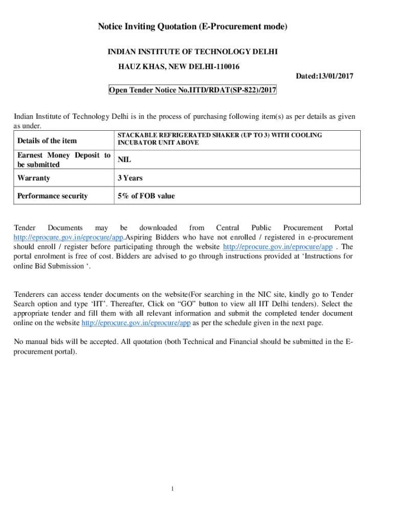 Get the free Notice Inviting Quotation (e-procurement Mode) for Stackable Refrigerated Shaker