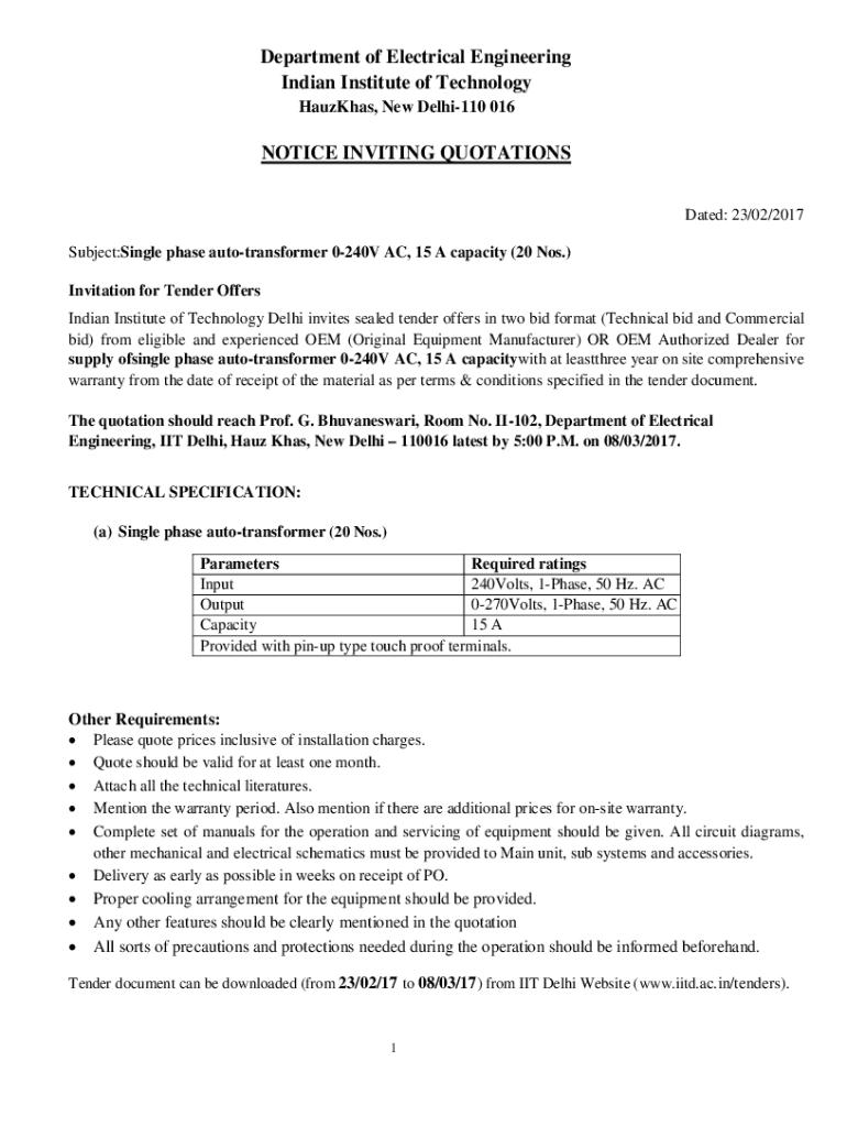 Get the free Notice Inviting Quotations for Single Phase Auto-transformer