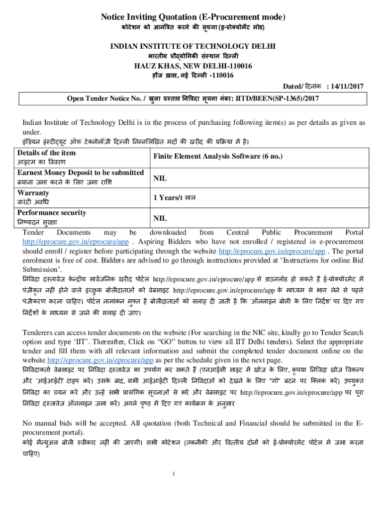 This document is a notice inviting quotations for the supply of Finite Element Analysis Software by the Indian Institute of Technology Delhi, detailing specifications, submission instructions, and