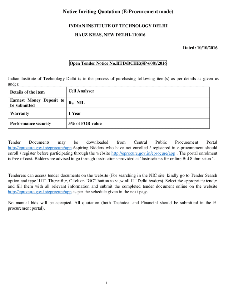 Get the free Notice Inviting Quotation (e-procurement Mode)