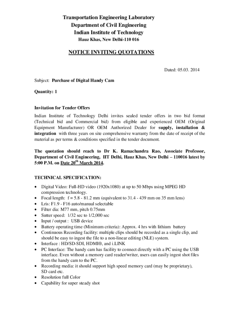 This document invites sealed tender offers for the purchase of a Digital Handy Cam by the Department of Civil Engineering at IIT Delhi, detailing specifications, bidding process, and conditions.
