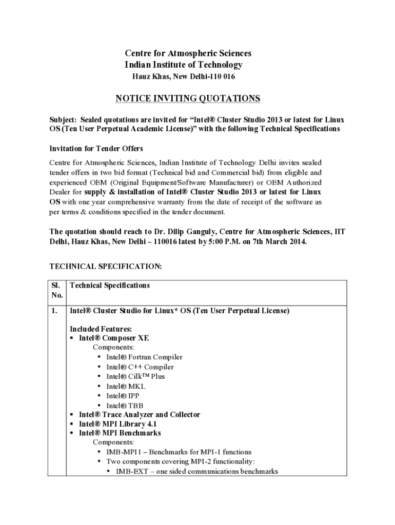 This document invites sealed quotations for the supply and installation of Intel® Cluster Studio 2013 for Linux OS, including specifications and terms of submission.