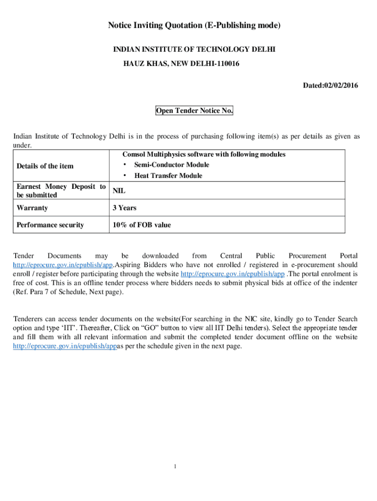 This document is an official tender notice inviting quotations for the purchase of Comsol Multiphysics software with specific modules from eligible bidders, detailing the specifications, submission