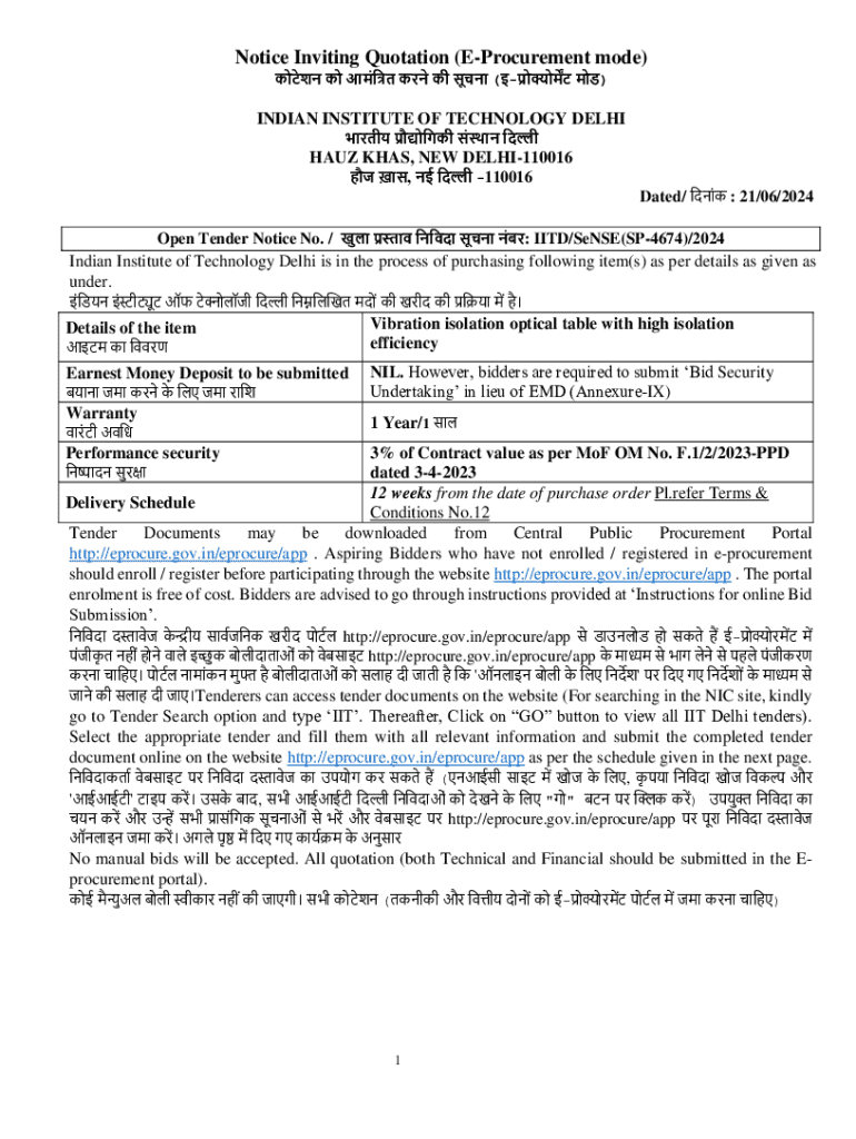 This document serves as an invitation for bids for the procurement of a vibration isolation optical table with high isolation efficiency to be supplied to the Indian Institute of Technology, Delhi.