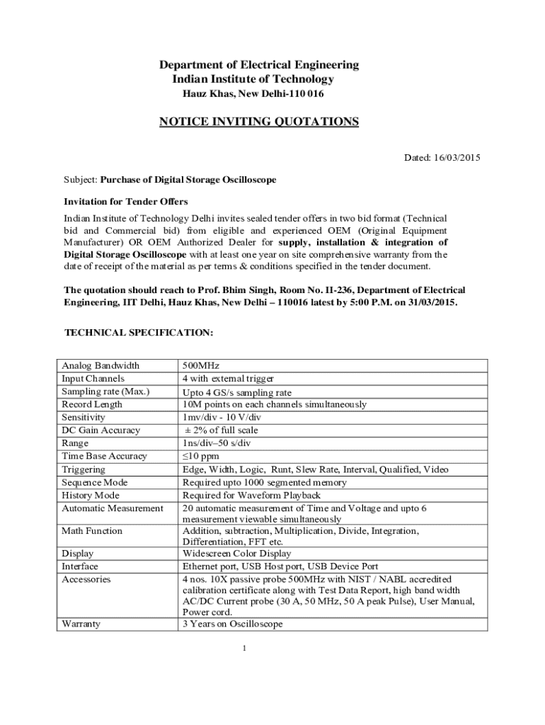 This document invites tenders for the supply, installation, and integration of Digital Storage Oscilloscope at IIT Delhi, detailing the requirements, specifications, and submission guidelines for