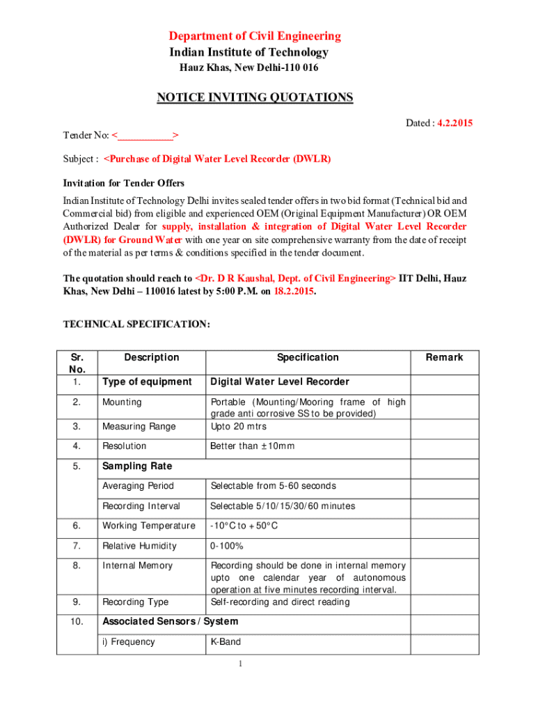 Get the free Notice Inviting Quotations for Digital Water Level Recorder