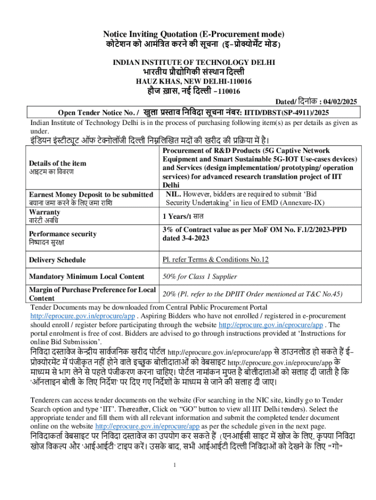 To fill out a notice inviting quotation e-procurement, users must provide details such as scope of work, submission deadlines, eligibility criteria, and any required forms or templates.