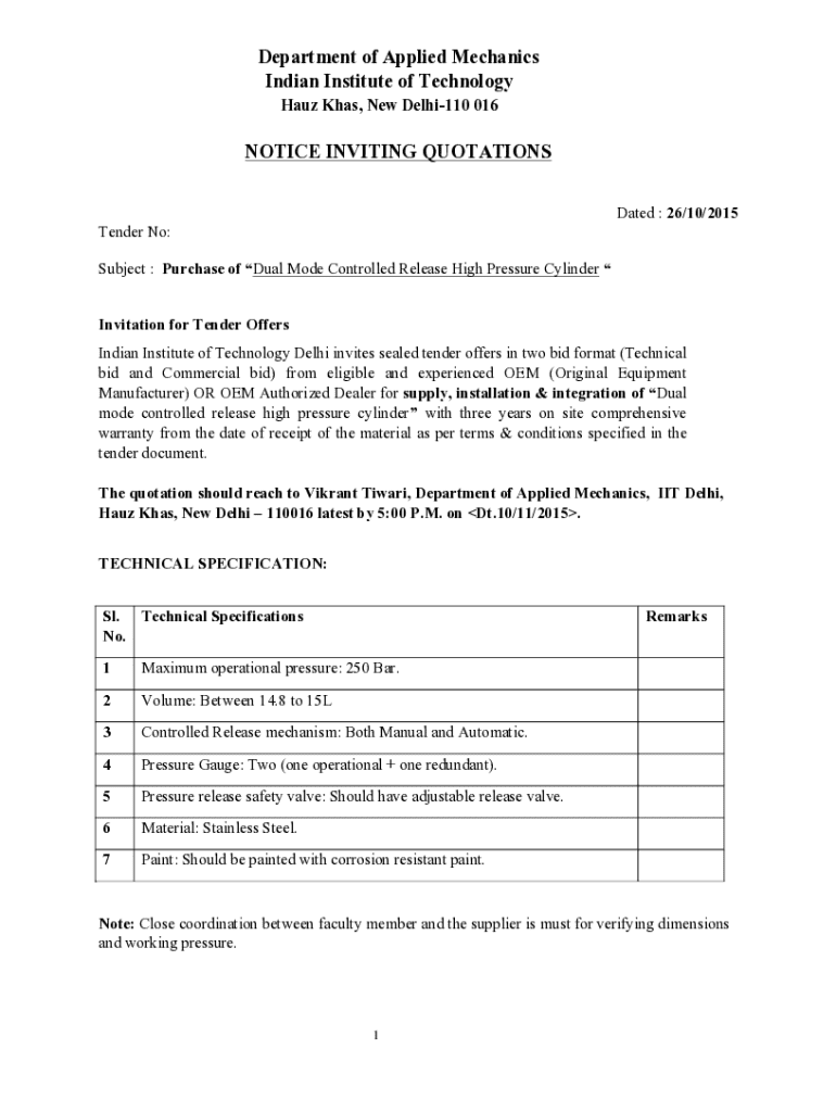 This document serves as a formal invitation for bids regarding the purchase, installation, and integration of a Dual Mode Controlled Release High Pressure Cylinder at the Indian Institute of Technology,
