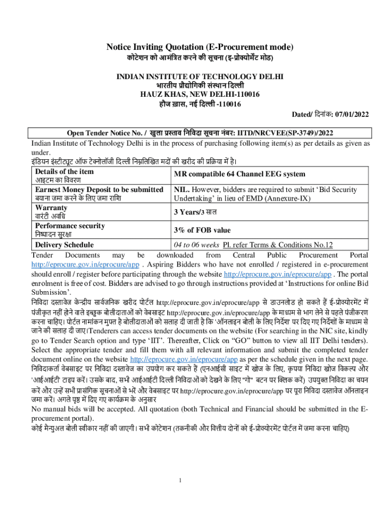 This document serves as a notice inviting quotations for the procurement of an MR compatible 64 channel EEG system by the Indian Institute of Technology Delhi. It outlines the specifications of the