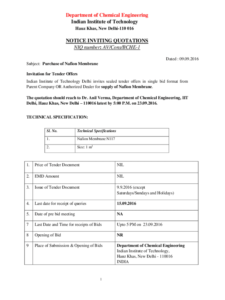 This document invites sealed tender offers for the supply of Nafion Membrane to the Indian Institute of Technology Delhi, detailing specifications, submission procedures, and terms and conditions.