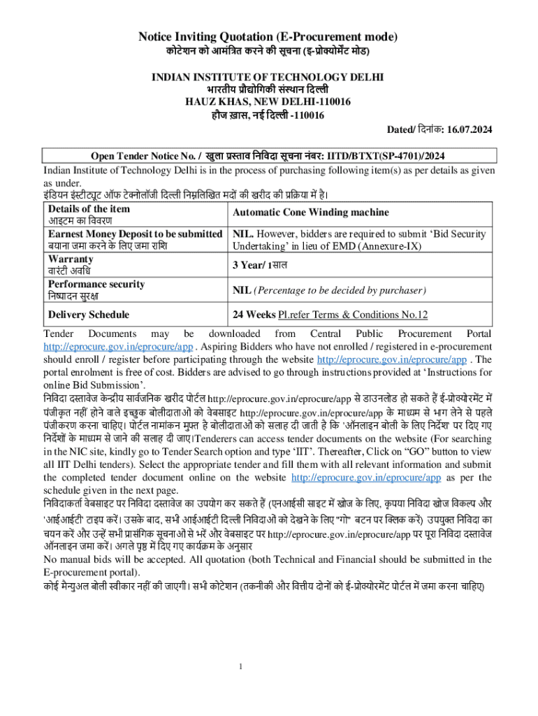 This document serves as an open tender invitation for quotes on an Automatic Cone Winding Machine by the Indian Institute of Technology Delhi, detailing submission requirements and technical specifications.