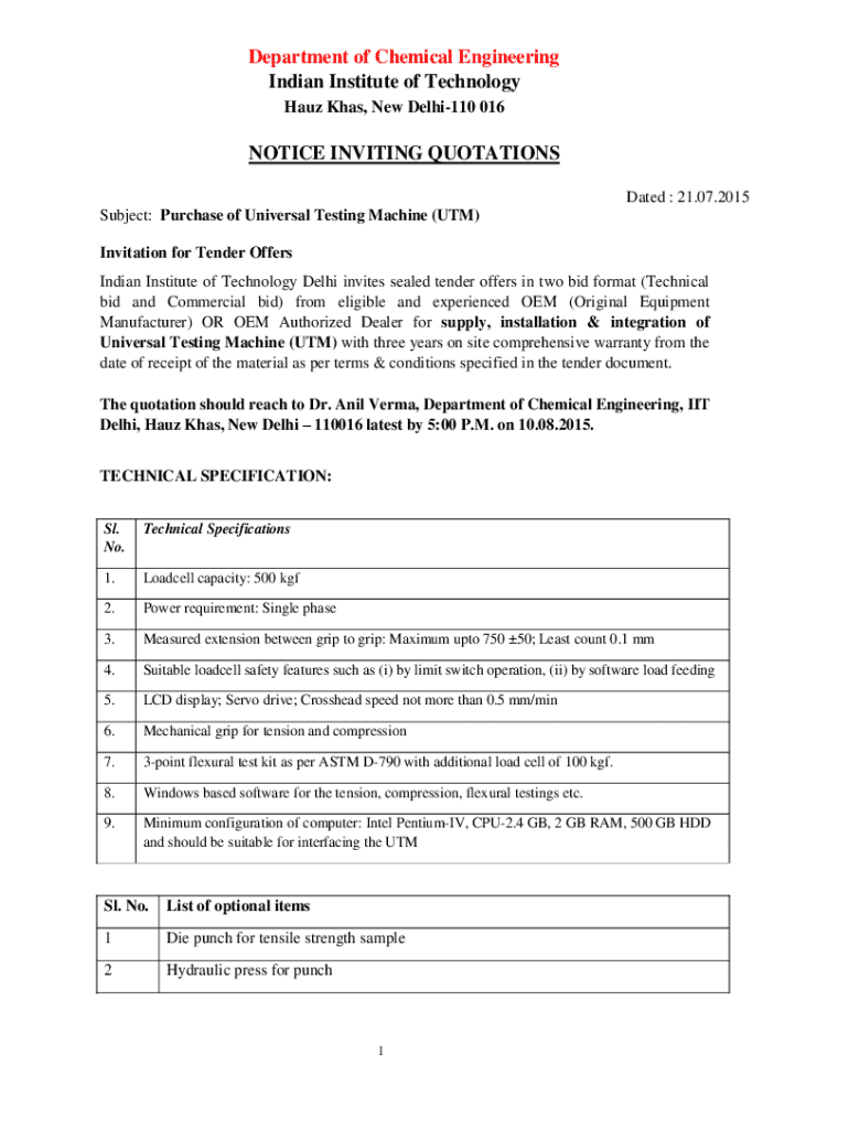 Get the free Notice Inviting Quotations for Universal Testing Machine