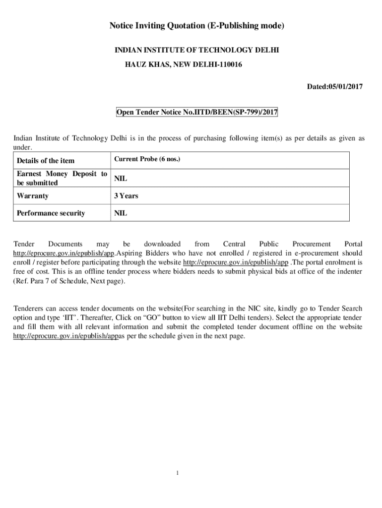 This document serves as a formal notice inviting bids for the purchase of Current Probes by the Indian Institute of Technology Delhi. It outlines the specifications, bidding process, and required