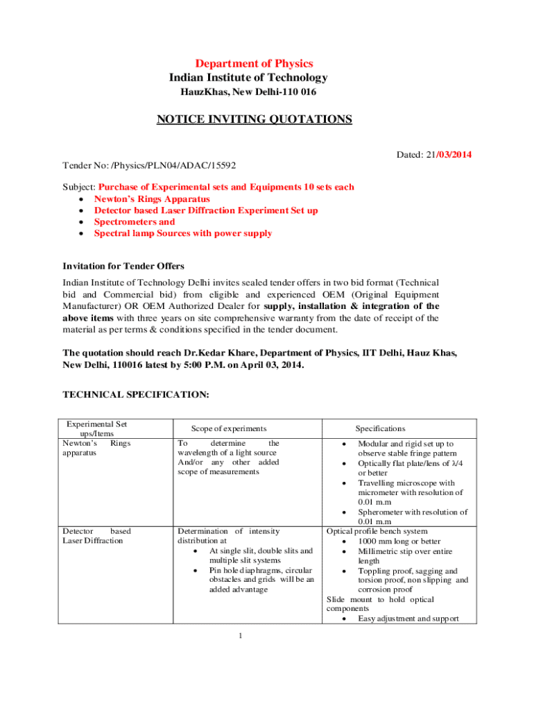This document serves as a formal invitation for tenders to supply and install experimental setups and equipment for the Department of Physics at IIT Delhi, including specifications for items and terms