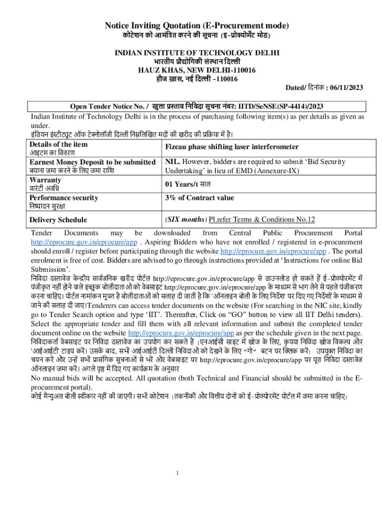This document invites bids from qualified bidders for the purchase of a Fizeau phase shifting laser interferometer for the Indian Institute of Technology Delhi, detailing specifications, submission
