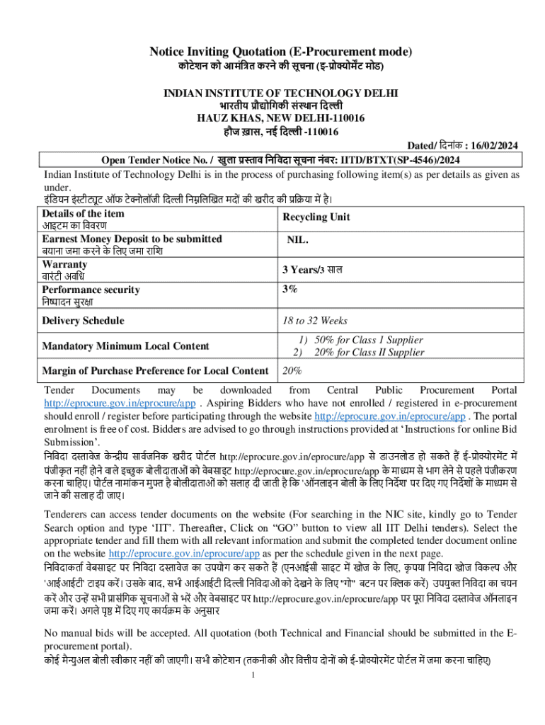 This document serves as a formal invitation for tenders for the purchase of a Recycling Unit by the Indian Institute of Technology Delhi, detailing specifications, submission guidelines, and terms