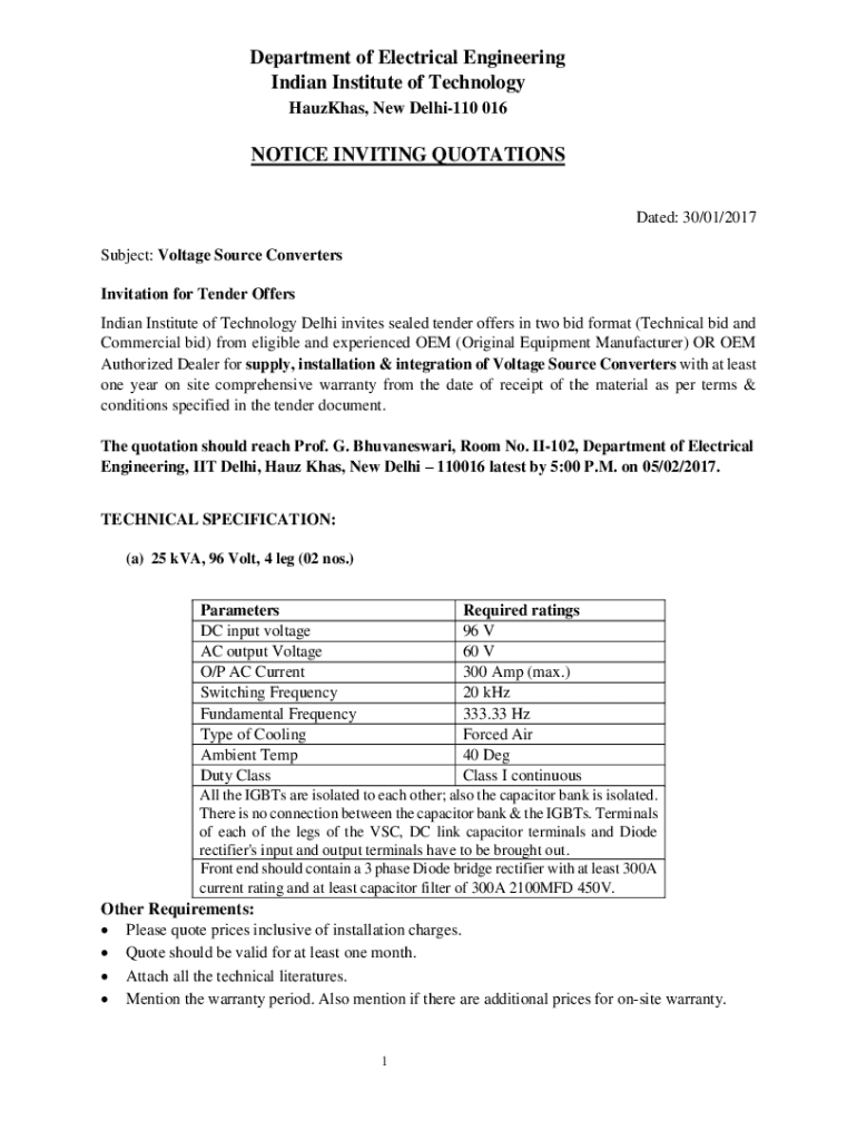 This document invites sealed tender offers for the supply, installation, and integration of Voltage Source Converters at the Indian Institute of Technology Delhi.