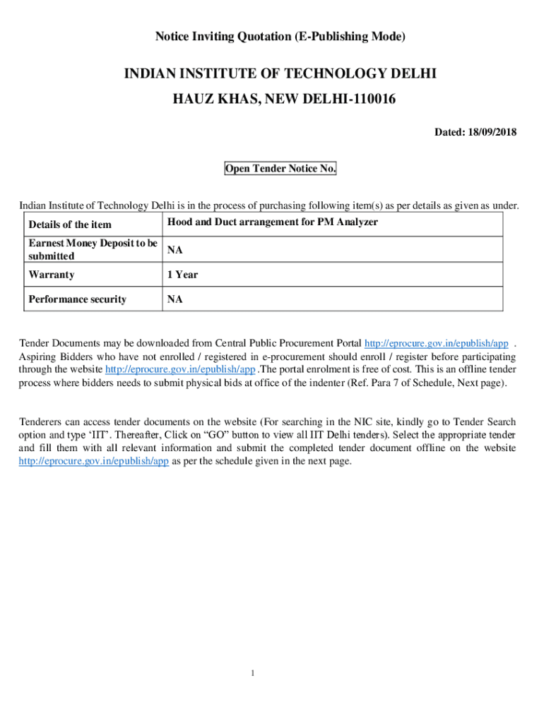 This document is a tender notice issued by the Indian Institute of Technology Delhi for the procurement of a Hood and Duct arrangement for PM Analyzer, detailing the requirements, bid submission processes,