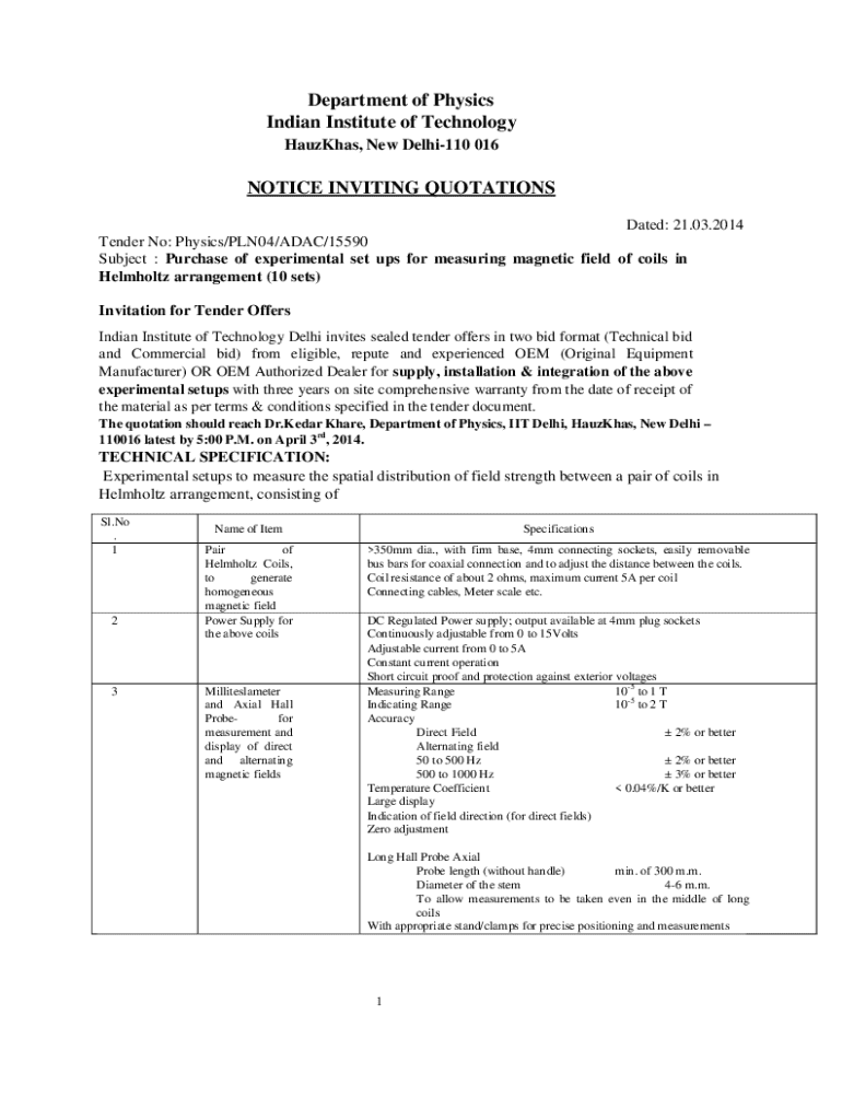 This document invites sealed tender offers for the purchase of experimental setups for measuring magnetic fields in a Helmholtz arrangement. It details specifications, bid submission procedures, and