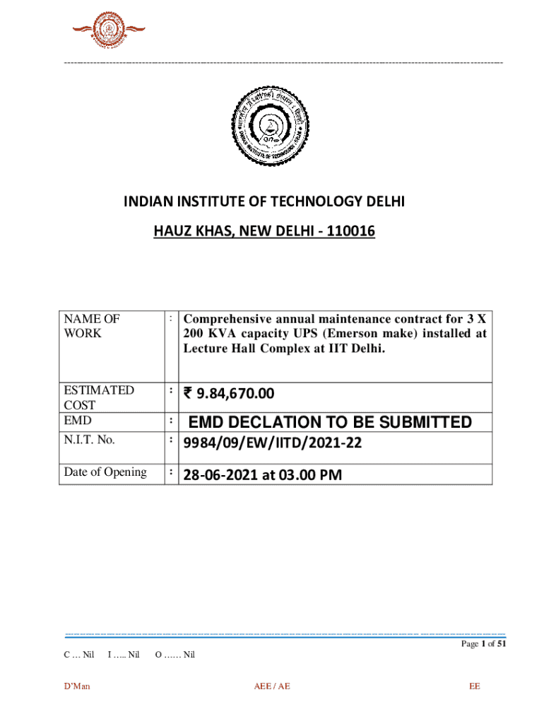 This document is a notice inviting tenders for a comprehensive annual maintenance contract for 3 X 200 KVA capacity UPS installed at the Lecture Hall Complex at IIT Delhi.