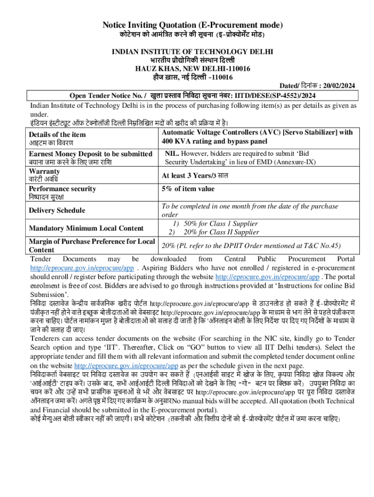 This document serves as an invitation for tender bids concerning the supply, installation, and integration of Automatic Voltage Controllers (AVC) with specific technical requirements, to be carried