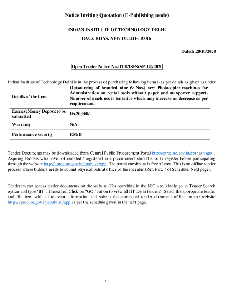 This document serves as a tender invitation for the outsourcing of nine new photocopier machines for the Indian Institute of Technology Delhi on a rental basis, including technical specifications,