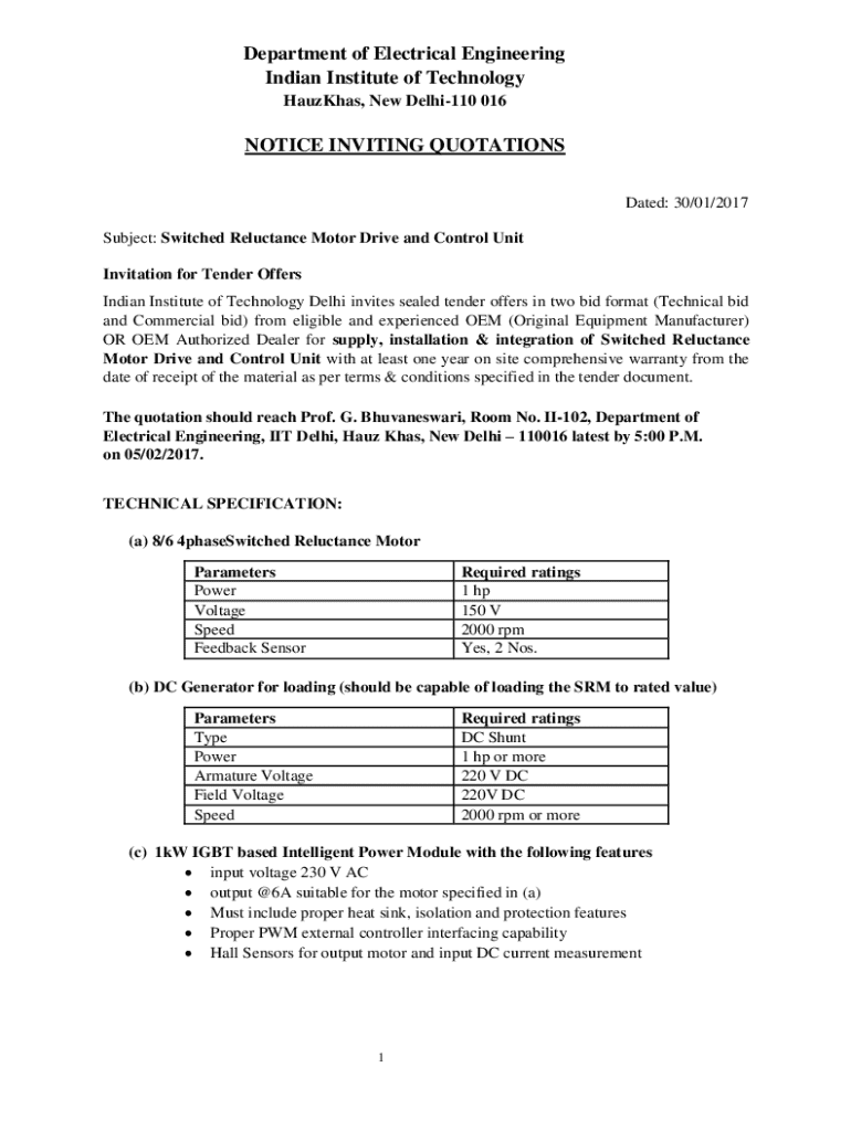 This document serves as an invitation for tender offers from OEMs and authorized dealers for the supply, installation, and integration of a Switched Reluctance Motor Drive and Control Unit, along