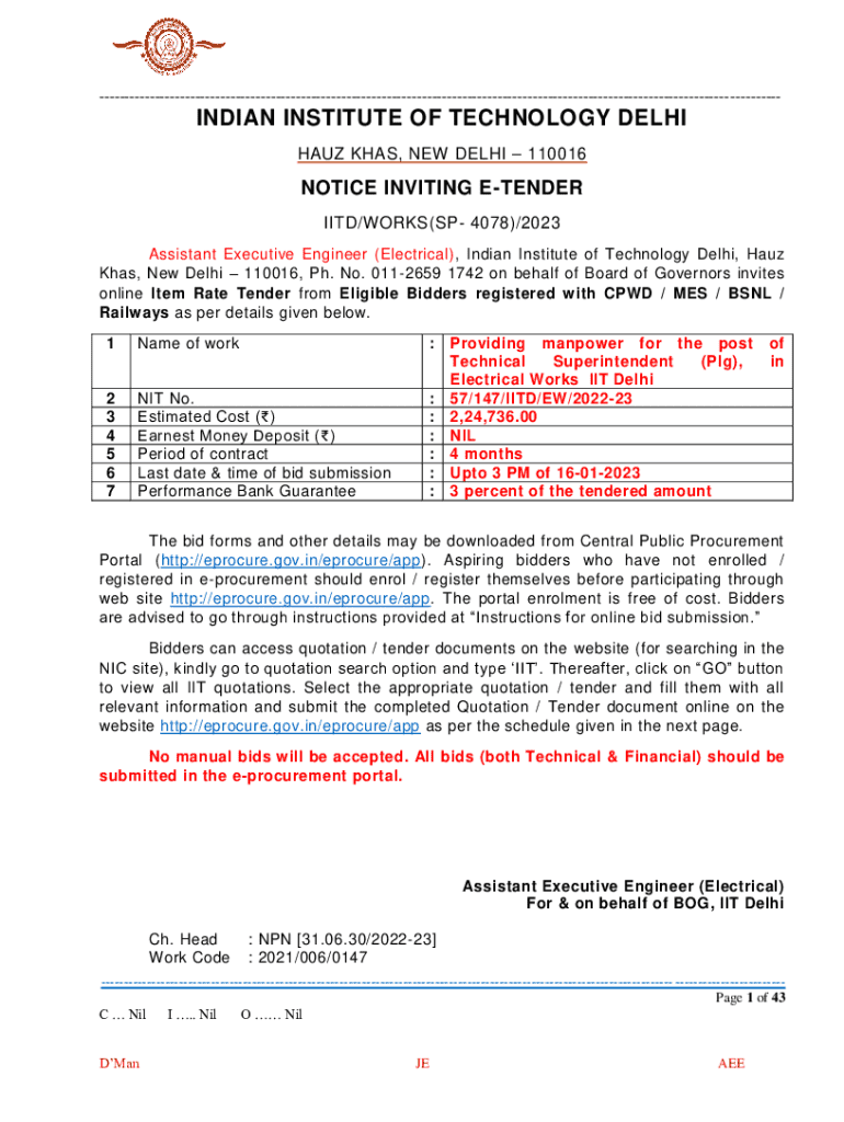 Get the free Notice Inviting E-tender - Iitd/works(sp- 4078)/2023