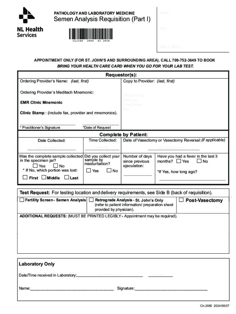 A semen analysis requisition form typically consists of several sections that collect necessary information for testing. Understanding these sections helps ensure accurate completion and submission.
