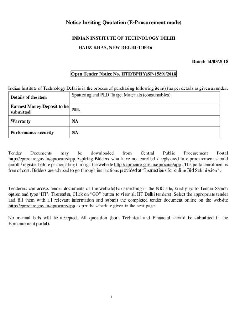 Get the free Notice Inviting Quotation (e-procurement Mode)