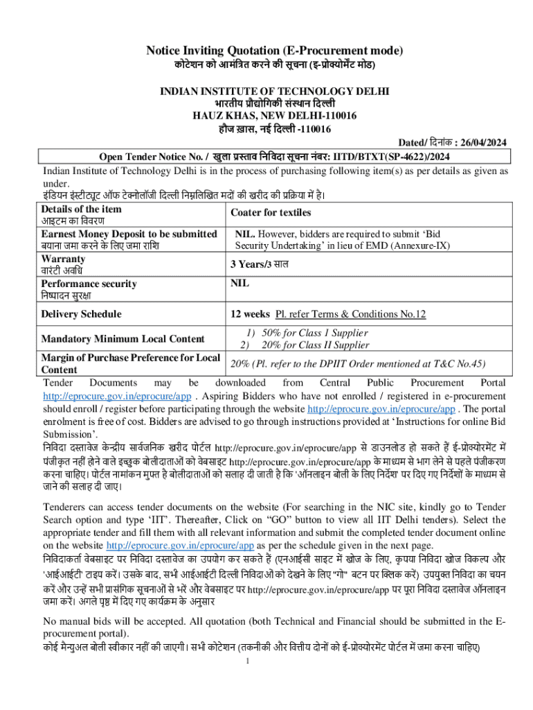 Get the free Notice Inviting Quotation (e-procurement Mode)