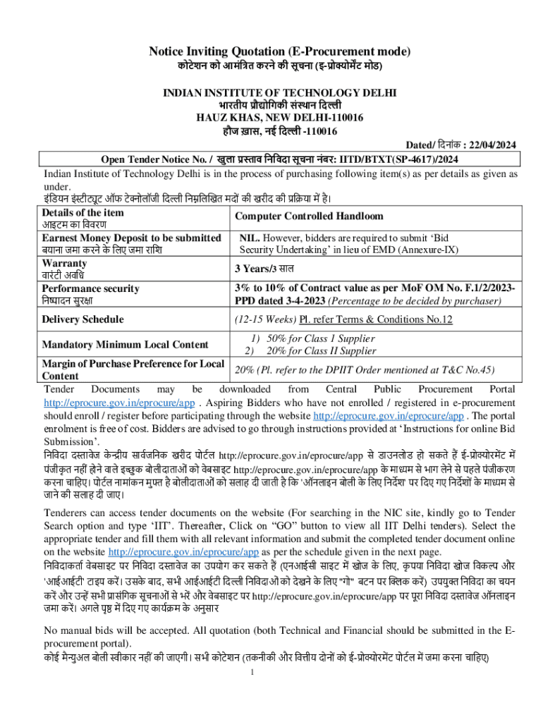 This document is an invitation for bids from eligible suppliers for the procurement of a Computer Controlled Handloom by the Indian Institute of Technology Delhi, detailing the requirements, terms,