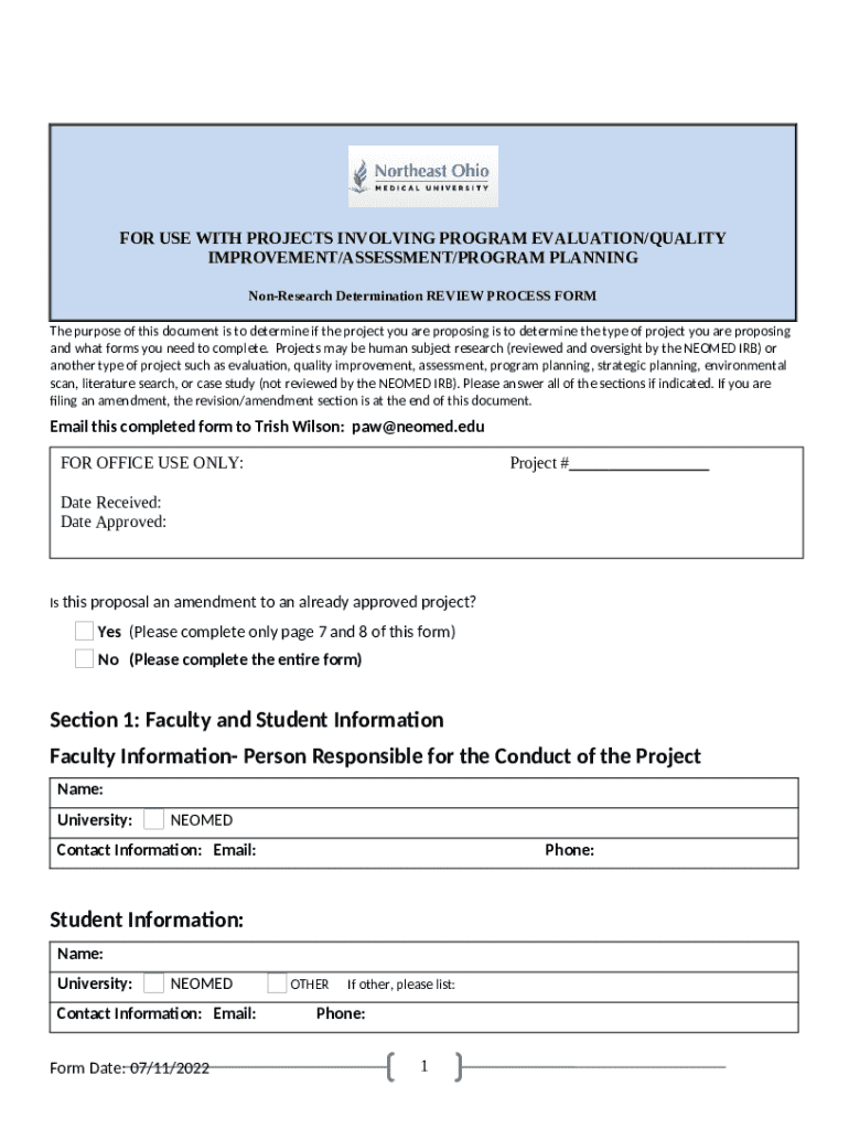 The Non-research Determination Review Process is a Word document which can be completed and signed for specific needs. Then, it is provided to the actual addressee to provide specific details and data. The completion and signing is able or via a trusted tool like PDFfiller. Such tools help to fill out any PDF or Word file without printing out. It also lets you customize it for the needs you have and put an official legal e-signature. Upon finishing, you send the Non-research Determination Review Process to the recipient or several of them by mail and even fax. PDFfiller provides a feature and options that make your template printable. It has various options for printing out appearance. It does no matter how you'll file a form after filling it out - physically or by email - it will always look professional and clear. To not to create a new document from scratch again and again, make the original Word file as a template. Later, you will have a customizable sample.
